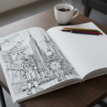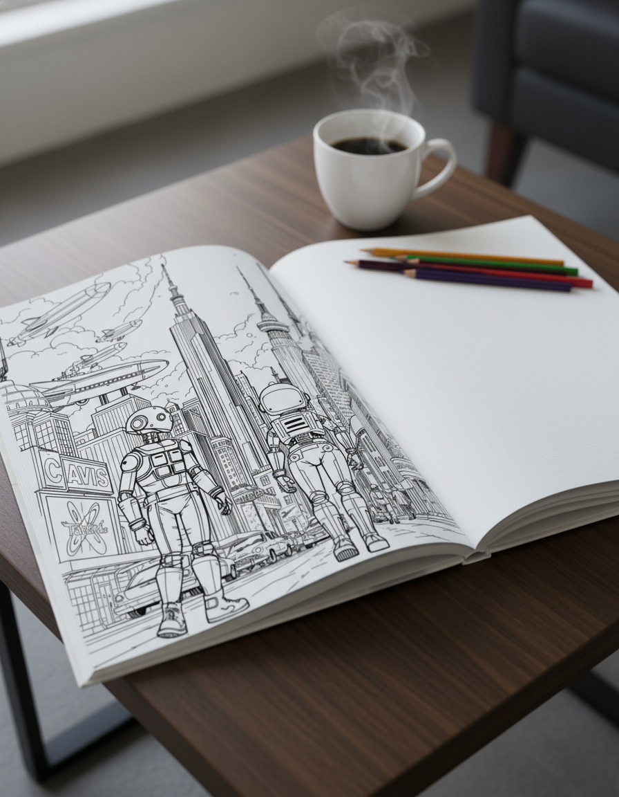 🎨 Páginas para colorear con ilustraciones inspiradas en el arte futurista y retrofuturista.